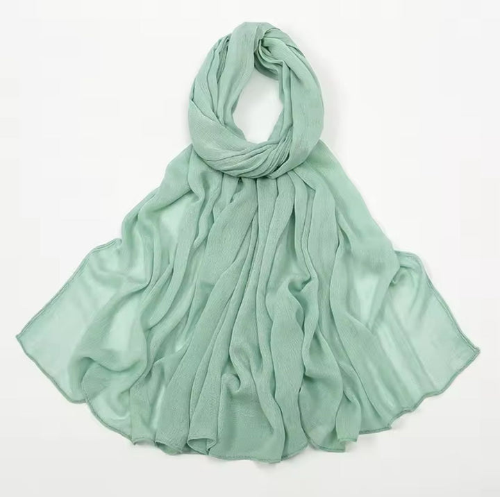 "Made from high-quality georgette chiffon, this PREMIUM PISTACHIO scarf is soft, lightweight, and perfect for any occasion. Its delicate texture adds an elegant touch to any outfit. Experience the luxurious feel and durability of georgette chiffon with this must-have accessory."